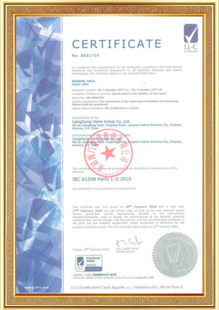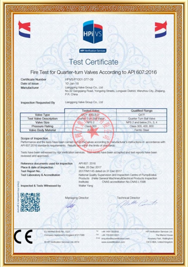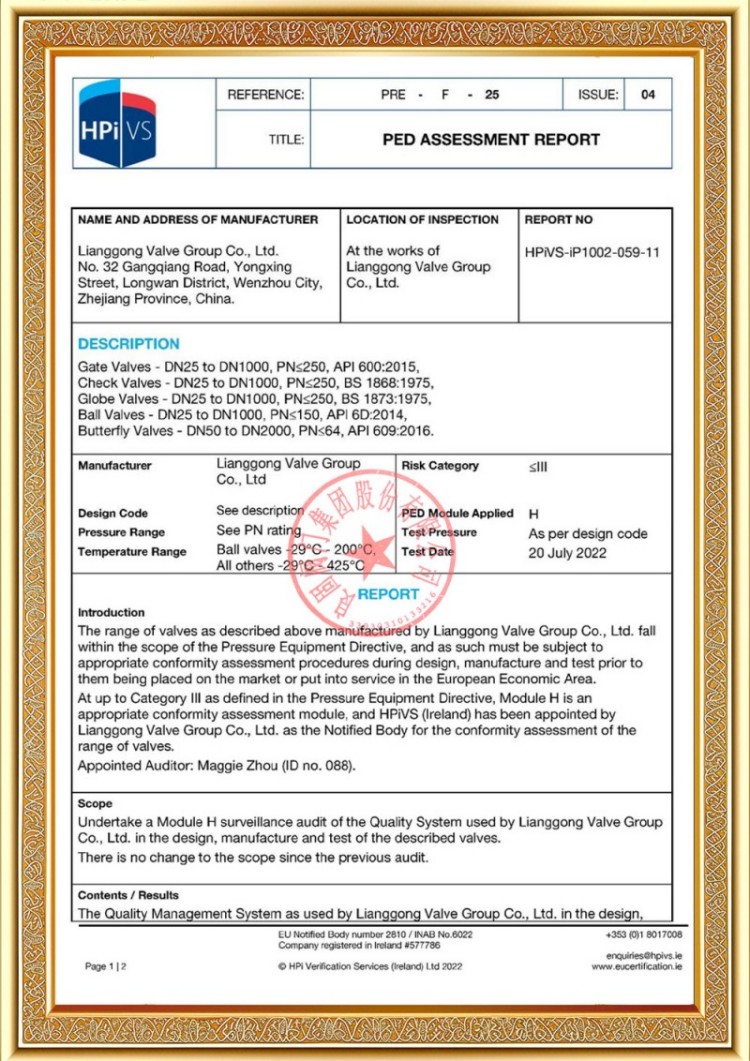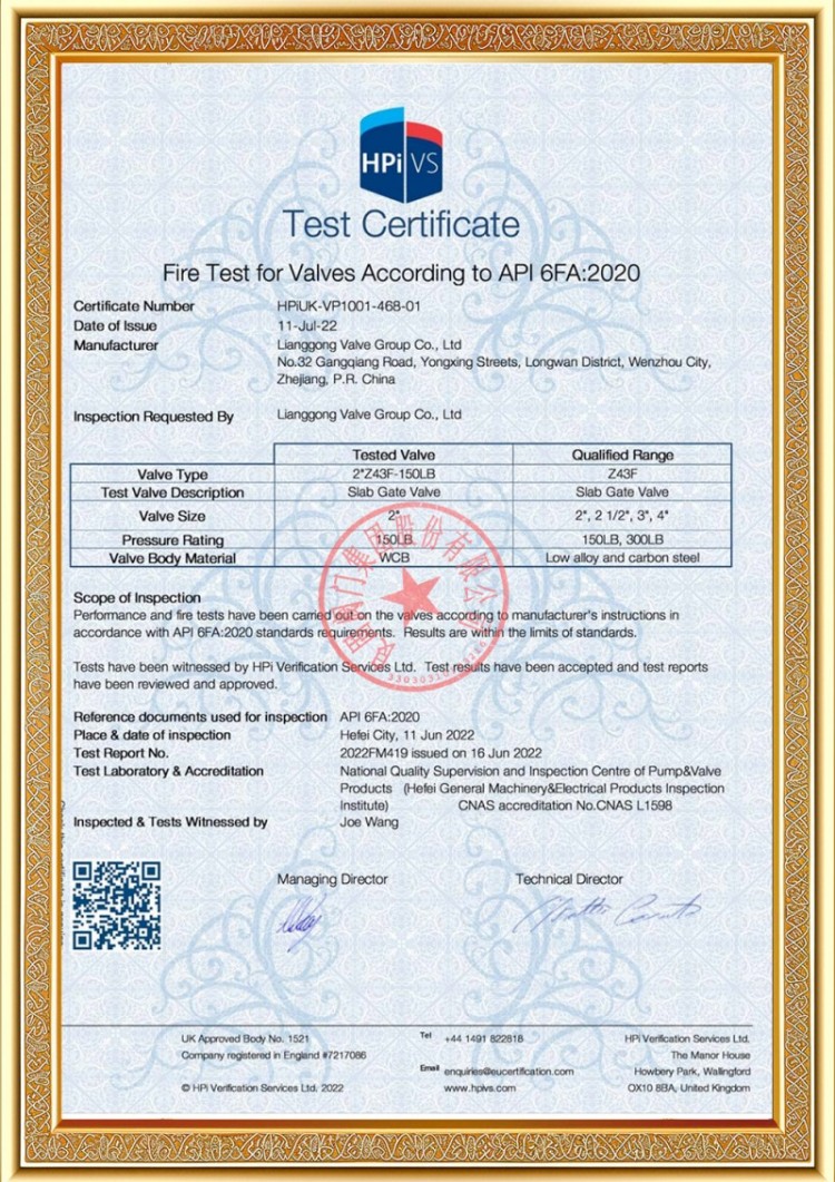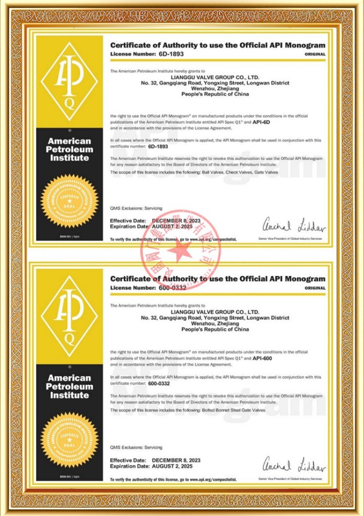 Perusahaan kita duwe macem-macem lisensi produksi katup pipa tekanan, lan produk kita wis lulus TS A1, ISO 9001, ISO 14001, ISO 45001, API 6D, API 600, APL 609, CE/PED, API 607, API 6FA, ISO 15848-1 lan sistem EAC lan sertifikasi produk. Kita uga duwe sertifikat paten penemuan kanggo macem-macem katup kayata katup bal, katup kupu, katup safety, lan katup mandeg.